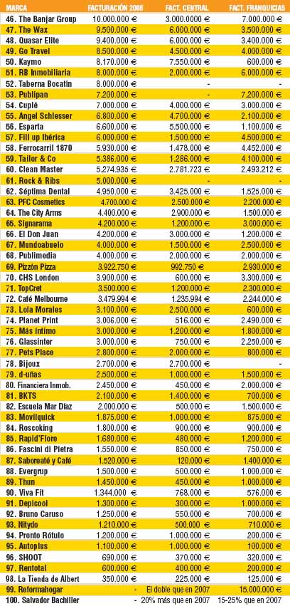 Las franquicias crecen en España. Tanto a nivel de facturación como de aperturas, las enseñas, en general, registran un crecimiento en sus redes. Las 100 empresas entrevistadas por Franquicias y Negocios prevén facturar durante este 2008 más de 4.853 millones de euros. De este total, el 40,6% es registrado por las centrales y los establecimientos propios, mientras que el 59,4% restante pertenece a las ventas de los establecimientos franquiciados.